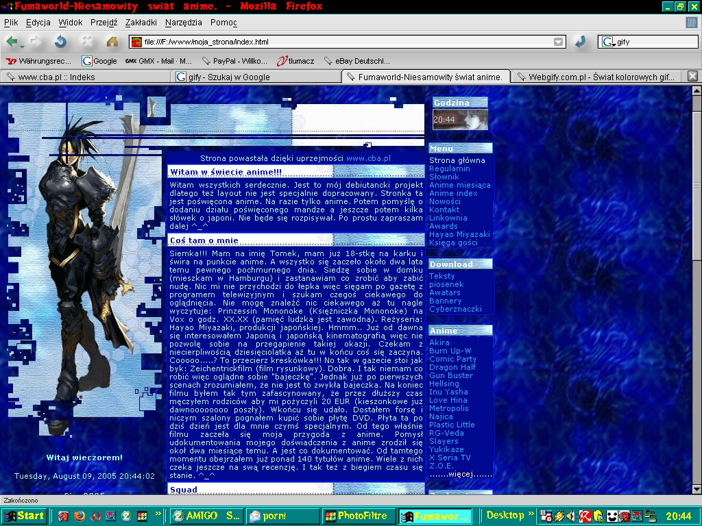AnimaniaK 1 I tak oto zmotywowany znikomą popularnością swojej strony przygotowałem kolejną wersję swojej strony opartą w sporej części na własnych skryptach JavaScript. Na screenie jest wersja beta, która z biegiem czasu uległa nieznacznej zmianie. Popularność strony z miesiąca na miesiąc zwiększała się w zadawalającym tempie.