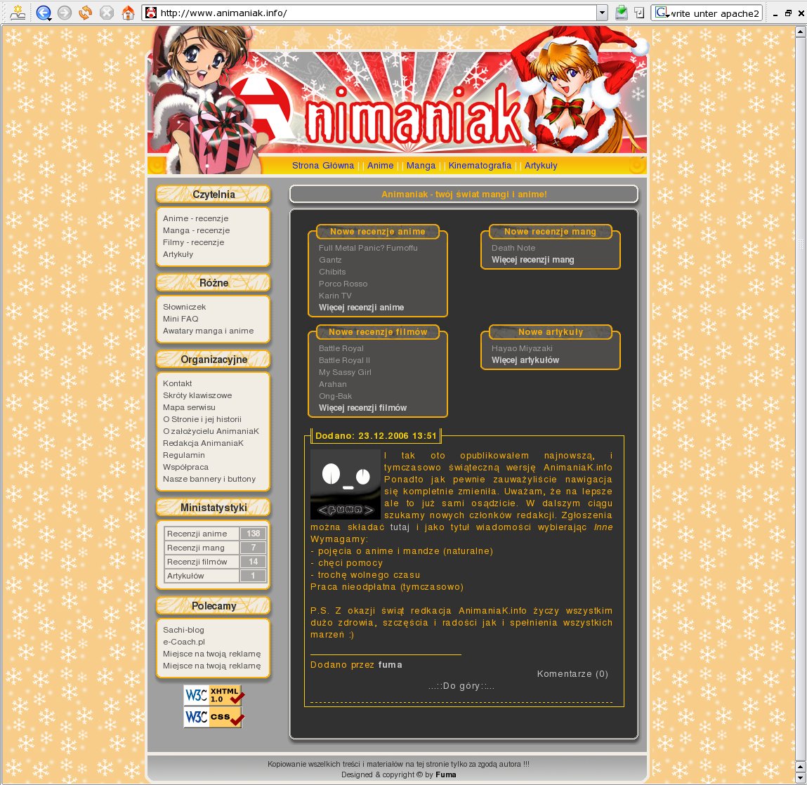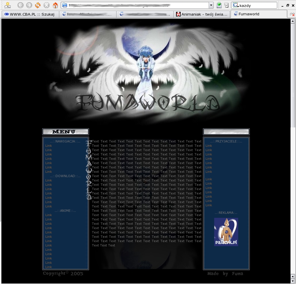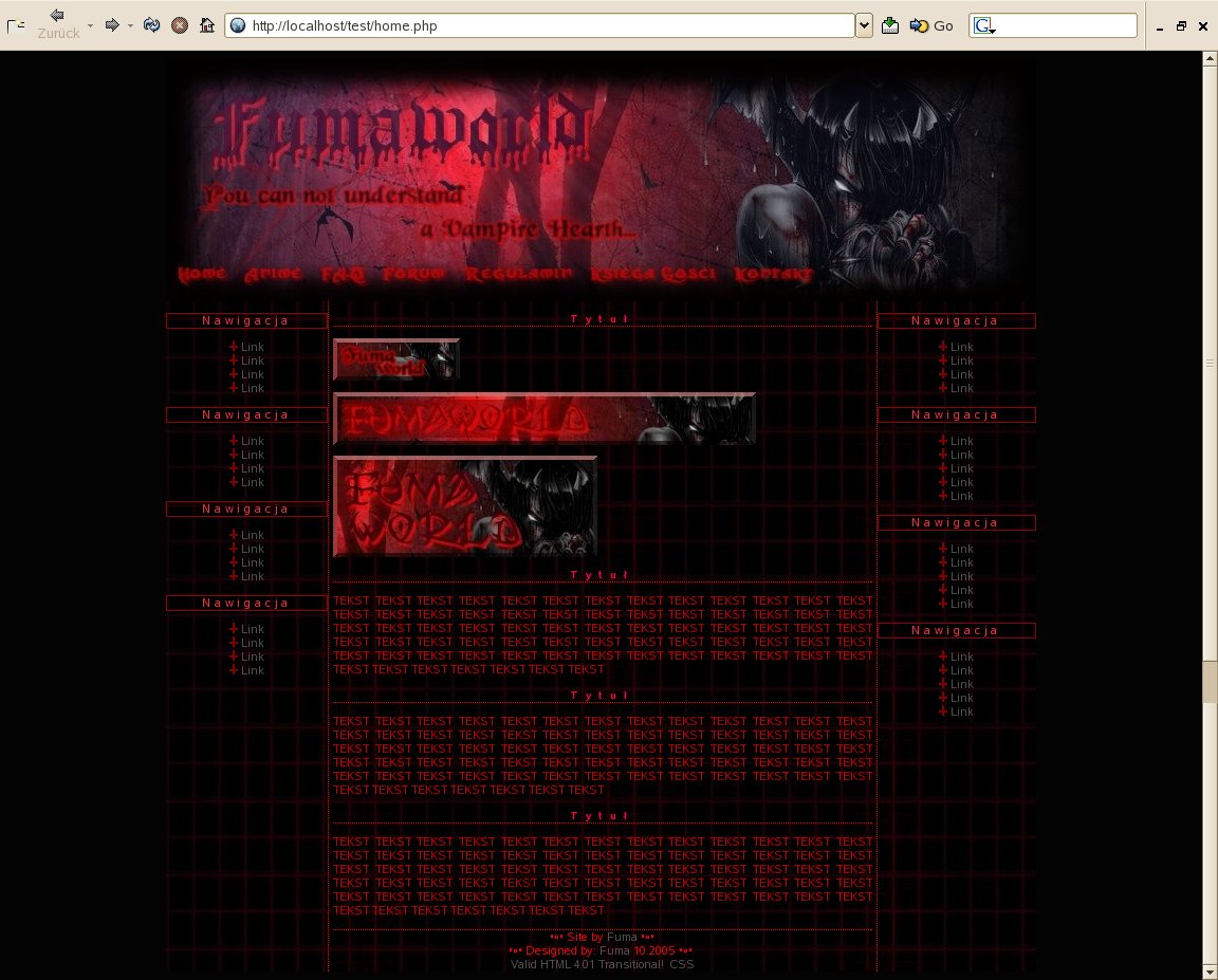 AnimaniaK 1 Hmmmm... Tak też wyglądała kiedyś strona AnimaniaK (wtedy jeszcze fumaworld). Dokładnej daty publikacji nie pamiętam ale powstała gdzieś około 27 grudnia 2005. Wiele nie jestem w stanie napisać na temat tego layoutu, gdyż niewiele o nim pamiętam.